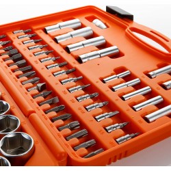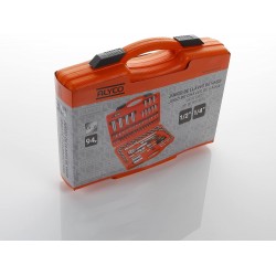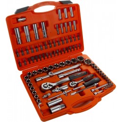 Juego de llaves de vaso de ½” + ¼” de 94 piezas fabricado en acero al Cromo Vanadio, máxima durabilidad y resistencia al desgaste.
