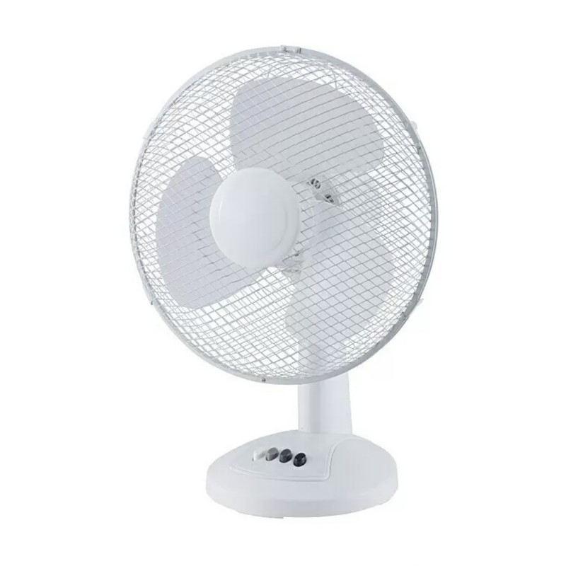 VENTILADOR DE SOBREMESA. 35W 30 cm. 2 posiciones: Fijo y rotativo. Difusor oscilante 80º. Rejilla de protección. Cable 1,6m.
